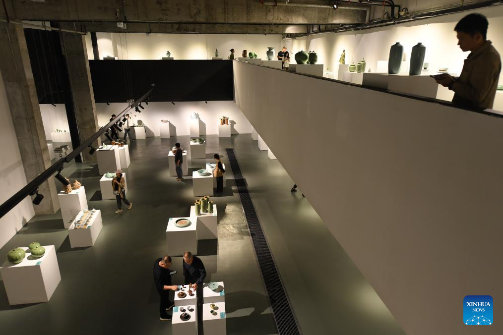 People visit a celadon exhibition in Longquan, east China's Zhejiang Province, Oct. 30, 2023. The 6th World Celadon Conference was held in Longquan City on Monday, along with a series of forums, exhibitions and skill competitions. (Xinhua/Weng Xinyang)