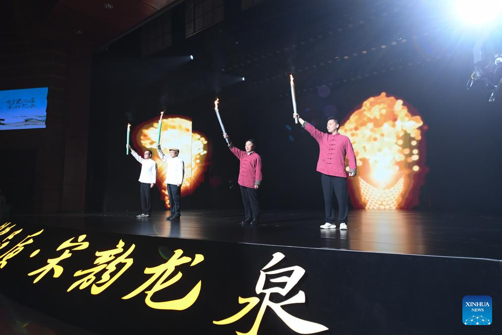Inheritors of celadon and sword-making skills raise symbolic kindling tools at the opening ceremony of the 6th World Celadon Conference in Longquan, east China's Zhejiang Province, Oct. 30, 2023. The 6th World Celadon Conference was held in Longquan City on Monday, along with a series of forums, exhibitions and skill competitions. (Xinhua/Weng Xinyang)