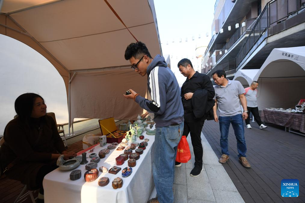 People visit a pottery and porcelain market in a cultural block in Longquan, east China's Zhejiang Province, Oct. 30, 2023. The 6th World Celadon Conference was held in Longquan City on Monday, along with a series of forums, exhibitions and skill competitions. (Xinhua/Weng Xinyang)