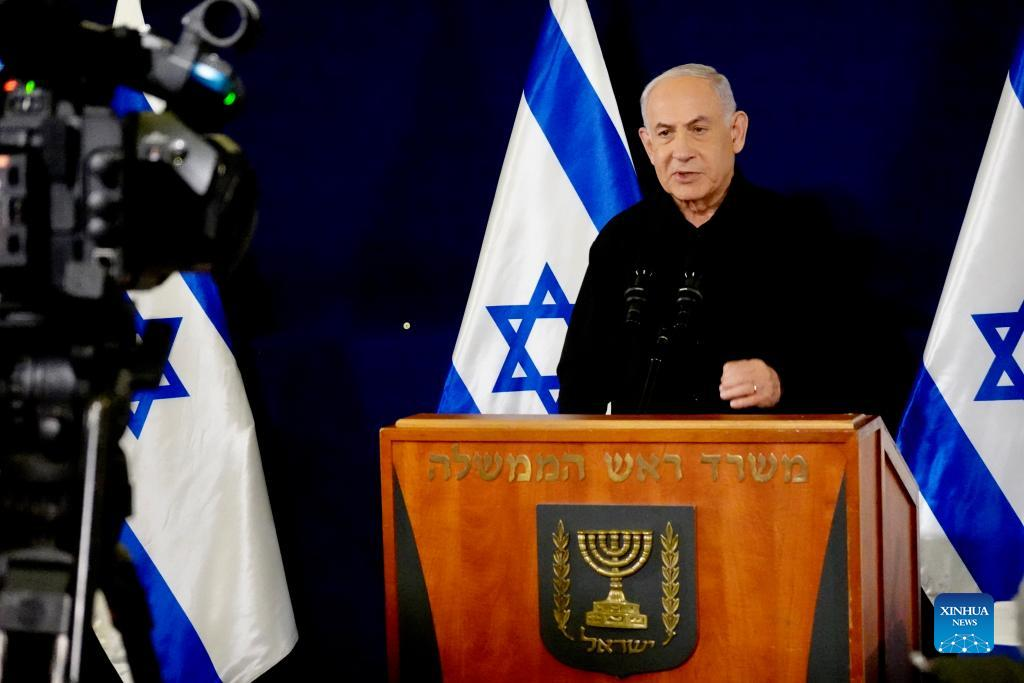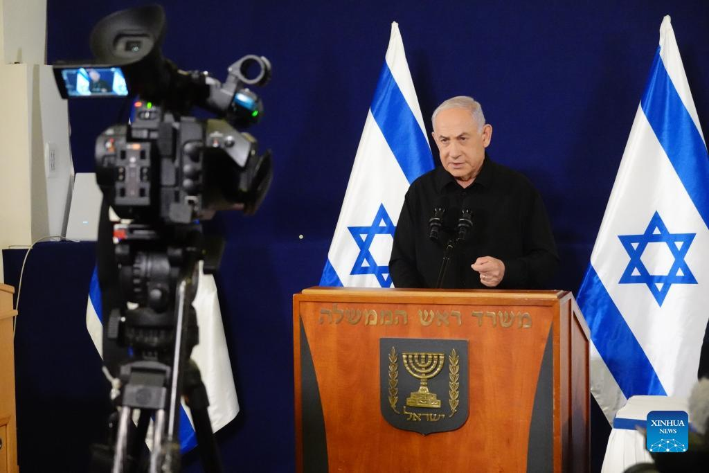Israeli Prime Minister Benjamin Netanyahu speaks at a press conference in Tel Aviv, Israel, on Oct. 30, 2023. Despite the international calls for a Gaza truce and the release of civilian detainees, Netanyahu said on Monday evening that a cease-fire "will not happen." (Xinhua/Wang Zhuolun)