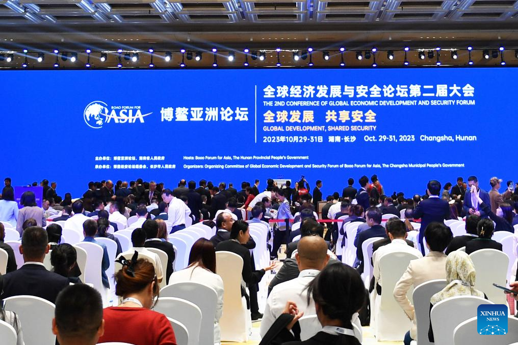 This photo taken on Oct. 30, 2023 shows the opening ceremony of the second conference of the Global Economic Development and Security Forum of the Boao Forum for Asia (BFA) in Changsha, central China's Hunan Province. With the theme of "Global Development, Shared Security," the event lasts three days. (Xinhua/Chen Zhenhai)