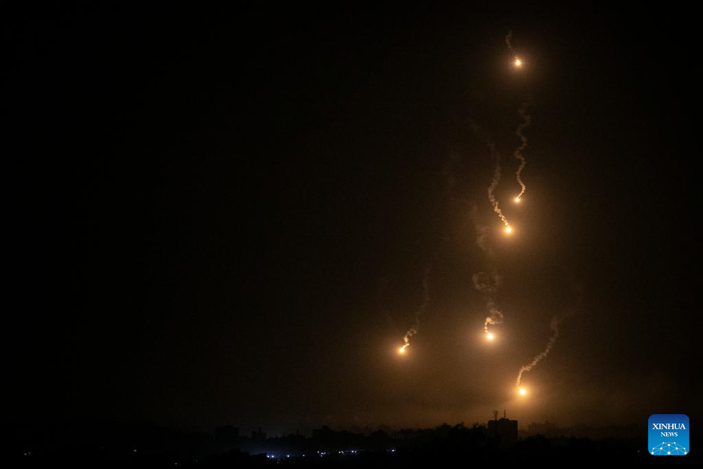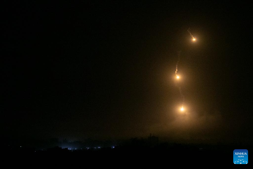 This photo taken on Oct. 30, 2023 shows Israeli flares falling in northern Gaza Strip, as seen from Israel's border with Gaza. The death toll of Palestinians from Israeli attacks on the Gaza Strip has risen to 8,382, according to the official Palestinian news agency of WAFA, while more than 1,400 people in Israel lost their lives, the vast majority in the Hamas attack on Oct. 7. (Xinhua/Chen Junqing)