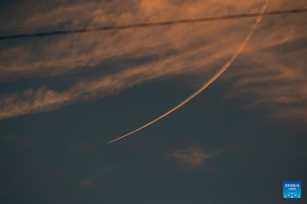 An Israeli military plane patrols in the sky, as seen from Israel's border with Gaza on Oct. 30, 2023. The death toll of Palestinians from Israeli attacks on the Gaza Strip has risen to 8,382, according to the official Palestinian news agency of WAFA, while more than 1,400 people in Israel lost their lives, the vast majority in the Hamas attack on Oct. 7. (Xinhua/Chen Junqing)