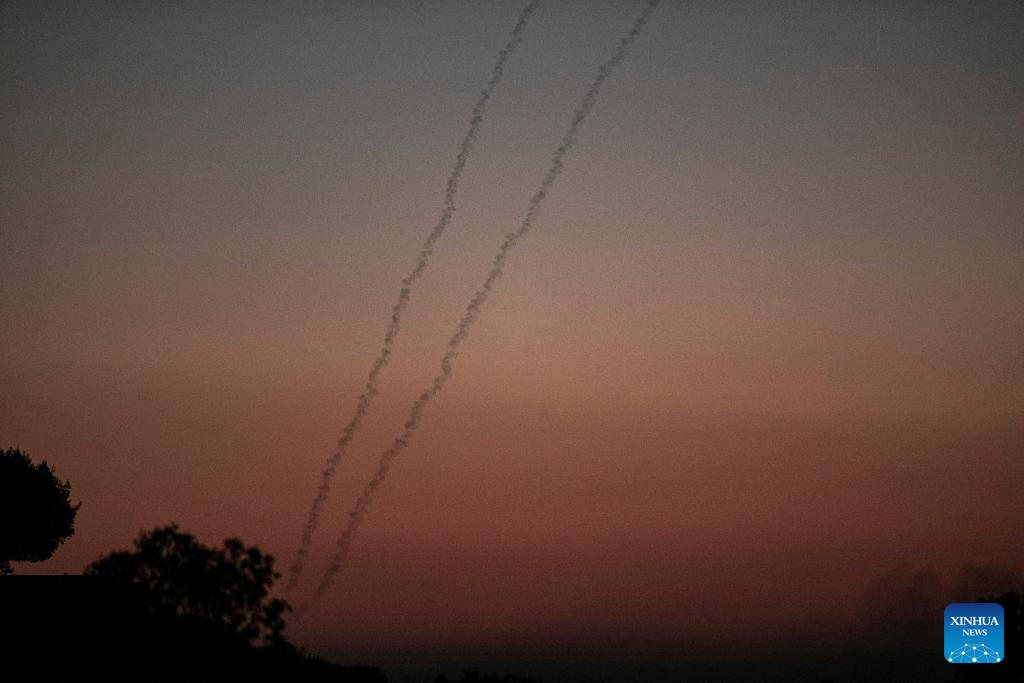 This photo taken on Oct. 30, 2023 shows rockets launched from the Gaza Strip, as seen from Israel's border with Gaza. The death toll of Palestinians from Israeli attacks on the Gaza Strip has risen to 8,382, according to the official Palestinian news agency of WAFA, while more than 1,400 people in Israel lost their lives, the vast majority in the Hamas attack on Oct. 7. (Xinhua/Chen Junqing)