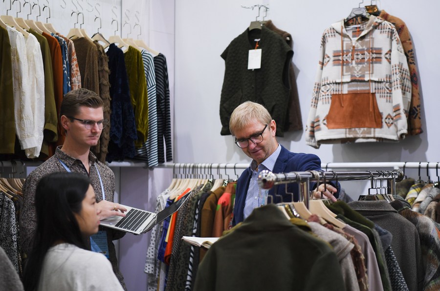 Foreign buyers negotiate business at a clothing booth during the third phase of the 134th Canton Fair in Guangzhou, south China's Guangdong Province, Oct. 31, 2023. (Xinhua/Deng Hua)