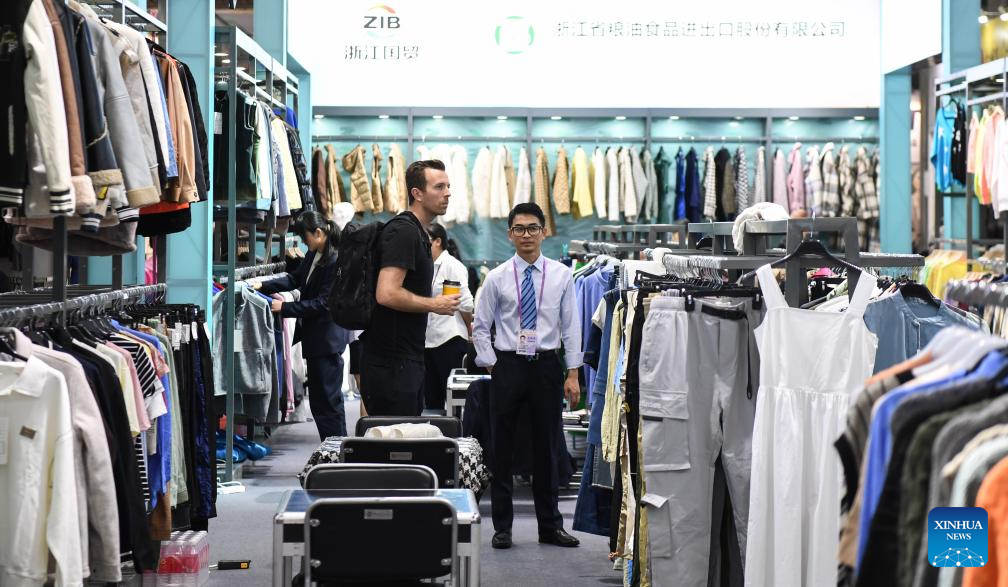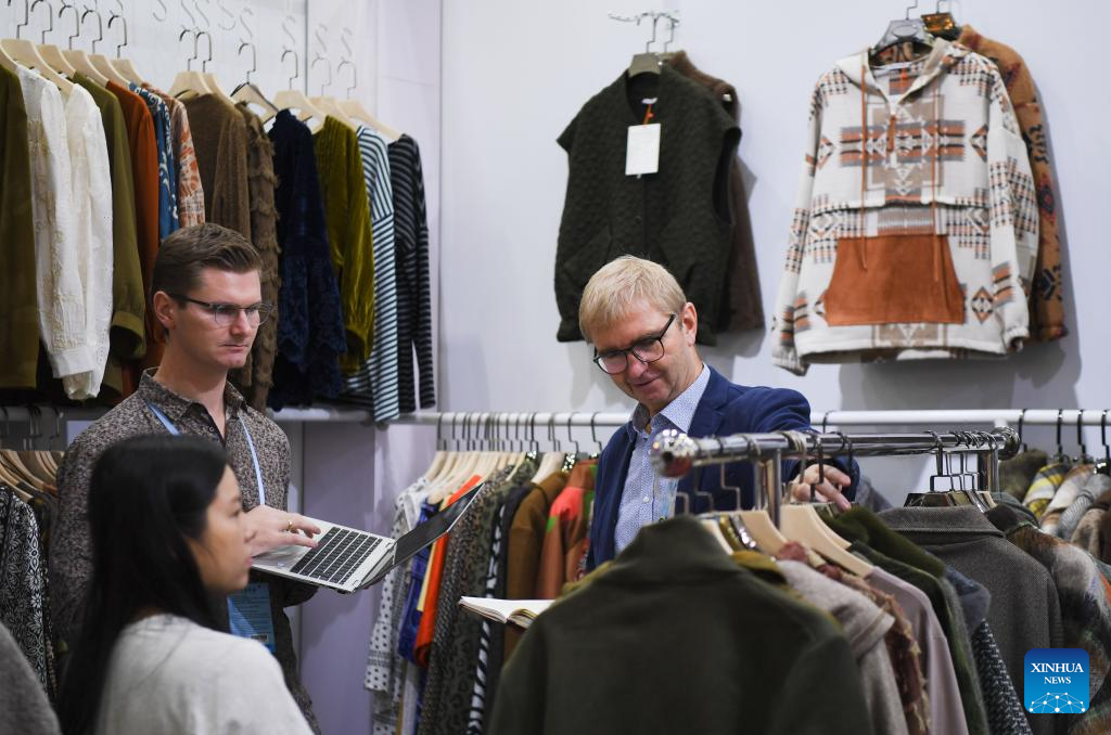 A foreign buyer visits a clothing booth during the third phase of the 134th Canton Fair in Guangzhou, south China's Guangdong Province, Oct. 31, 2023. The third phase of the 134th session of the China Import and Export Fair, also known as the Canton Fair, opened here on Tuesday and will last till Nov. 4. The event covers a total exhibition area of 515,000 square meters. (Xinhua/Deng Hua)