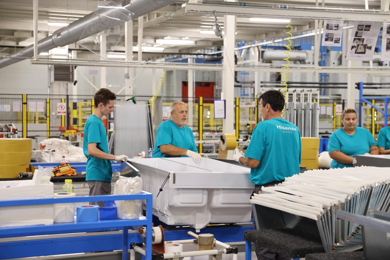 Workers assemble appliances at a refrigerator factory of Chinese home appliance giant Hisense Group in Valjevo, Serbia. (People's Daily/Liu Zhonghua)