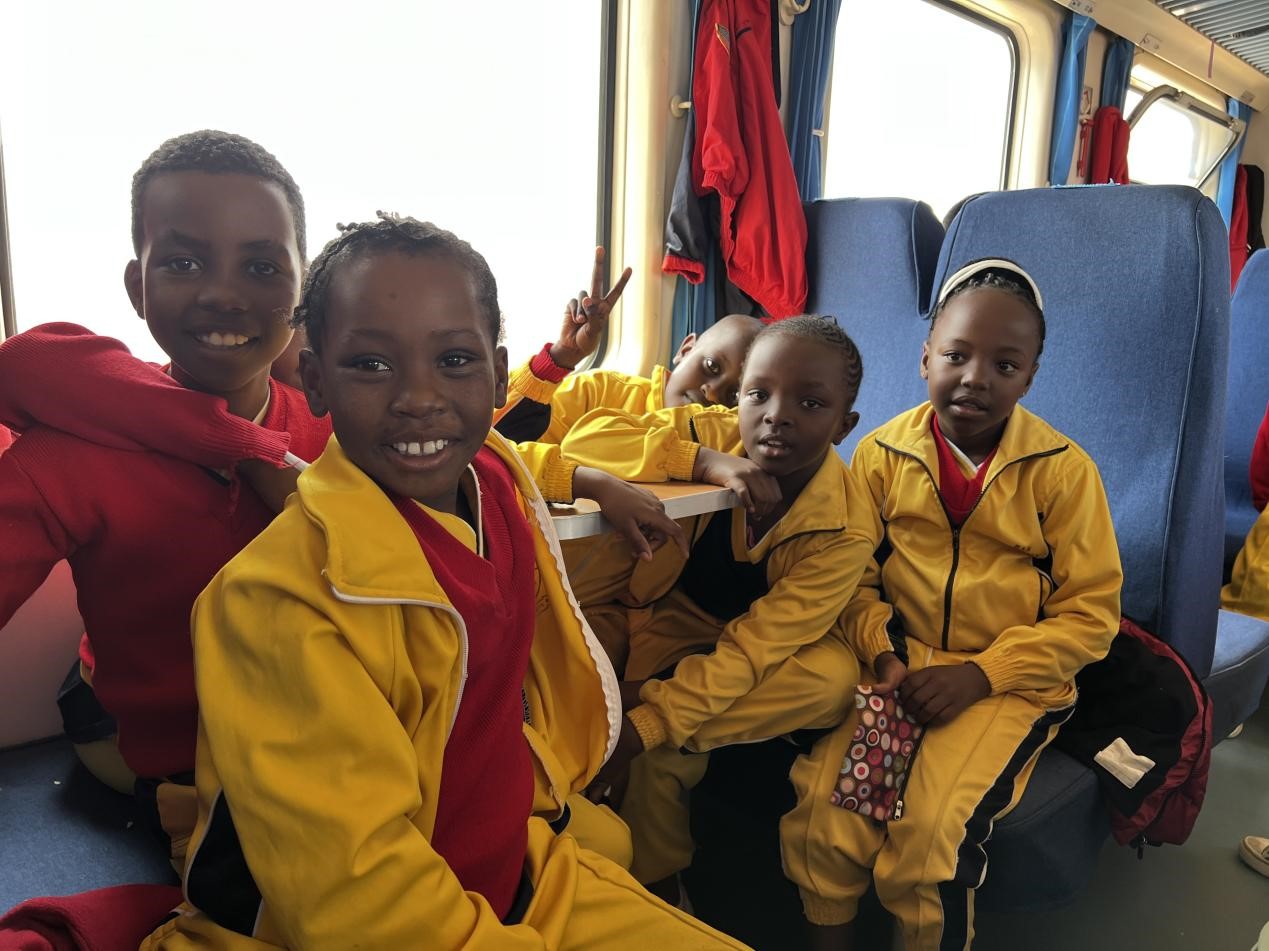 The Mombasa-Nairobi Standard Gauge Railway is a signature project of China-Kenya Belt and Road cooperation. Photo shows Kenyan students taking a train on the railway. (People's Daily/Zhang Zhiwen)