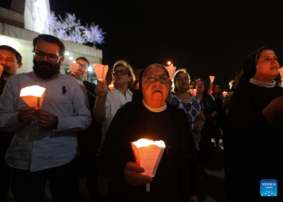 People offer prayers during a candlelight vigil in support of Palestinians in Amman, Jordan, on Oct. 31, 2023. (Photo by Mohammad Abu Ghosh/Xinhua)