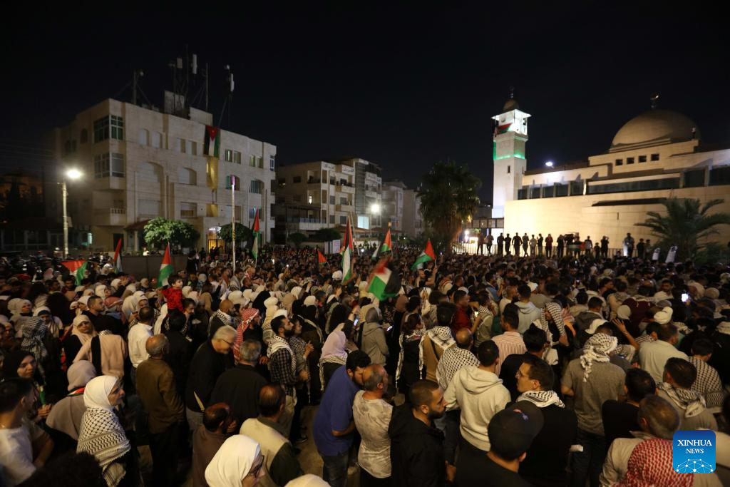 People take part in a rally to express their support for the Palestinians in Amman, Jordan, on Oct. 31, 2023. (Photo by Mohammad Abu Ghosh/Xinhua)