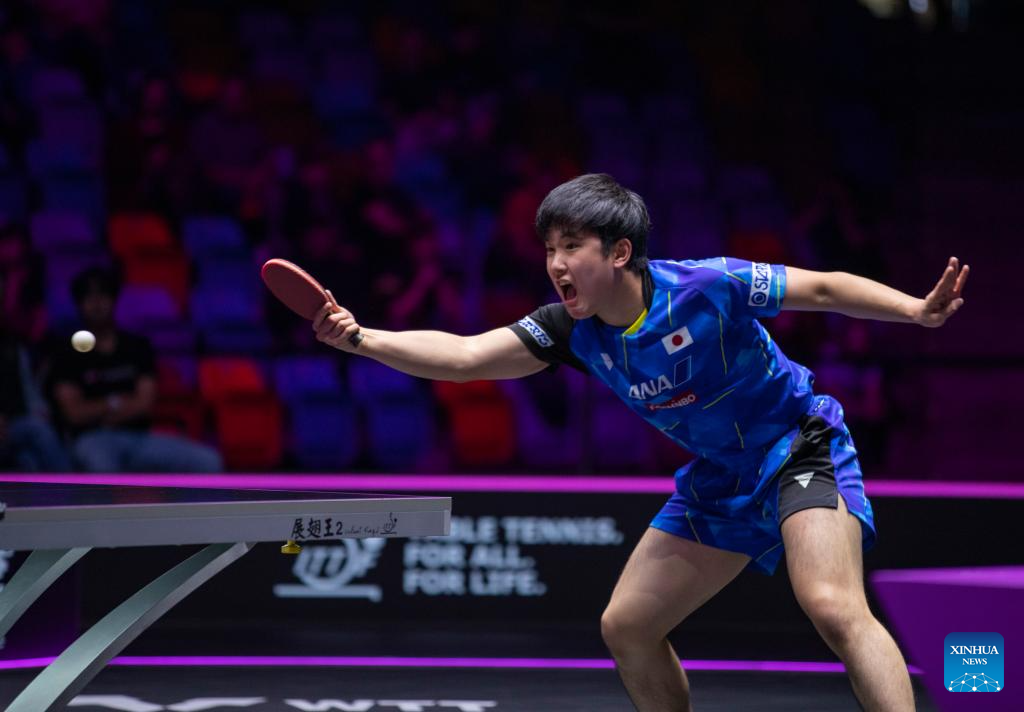 Harimoto Tomokazu of Japan hits a return during the men's singles round of 32 match against Jang Woojin of South Korea at the WTT Champions Frankfurt 2023 in Frankfurt, Germany, Oct. 31, 2023. (Xinhua/Zhang Fan)