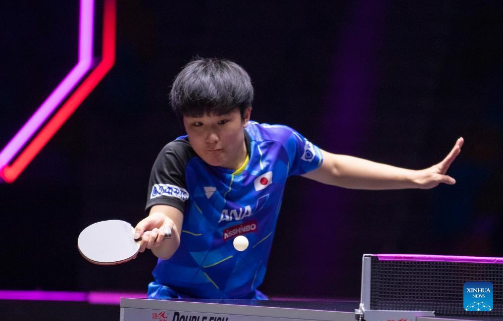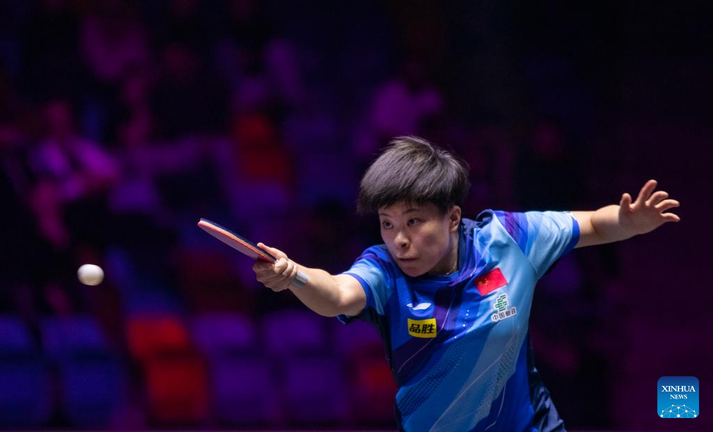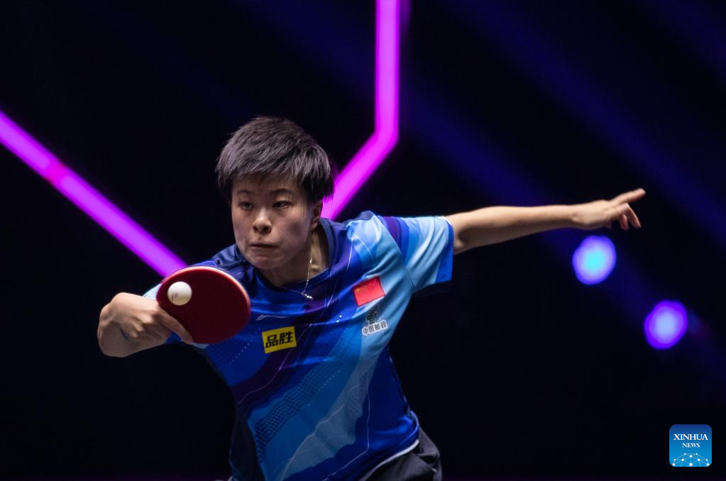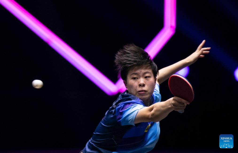 Wang Yidi of China hits a return during the women's singles round of 32 match against Sofia Polcanova of Austria at the WTT Champions Frankfurt 2023 in Frankfurt, Germany, Oct. 31, 2023. (Xinhua/Zhang Fan)