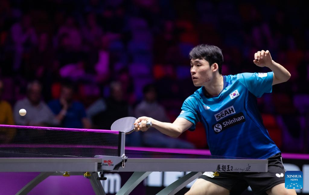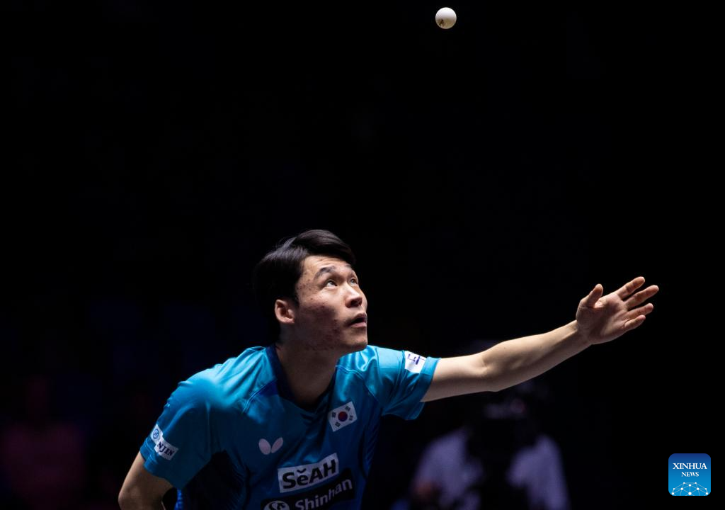 Jang Woojin of South Korea serves during the men's singles round of 32 match against Harimoto Tomokazu of Japan at the WTT Champions Frankfurt 2023 in Frankfurt, Germany, Oct. 31, 2023. (Xinhua/Zhang Fan)