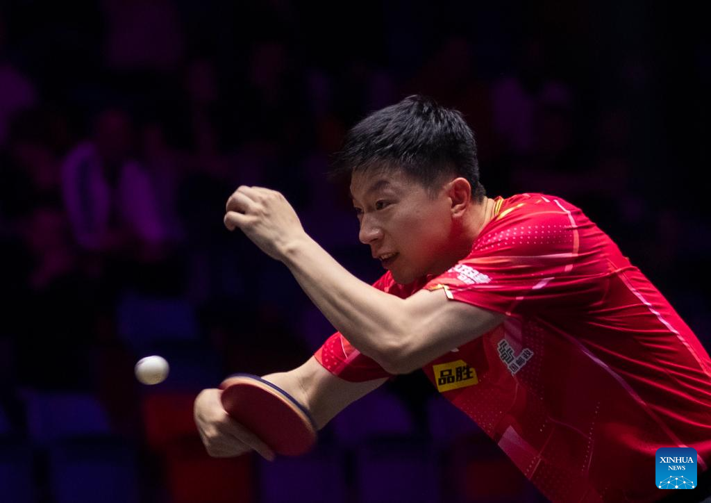 Ma Long of China hits a return during the men's singles round of 32 match against Chuang Chih-Yuan of Chinese Taipei at the WTT Champions Frankfurt 2023 in Frankfurt, Germany, Oct. 31, 2023. (Xinhua/Zhang Fan)