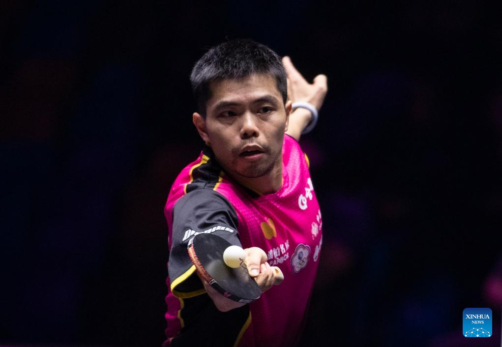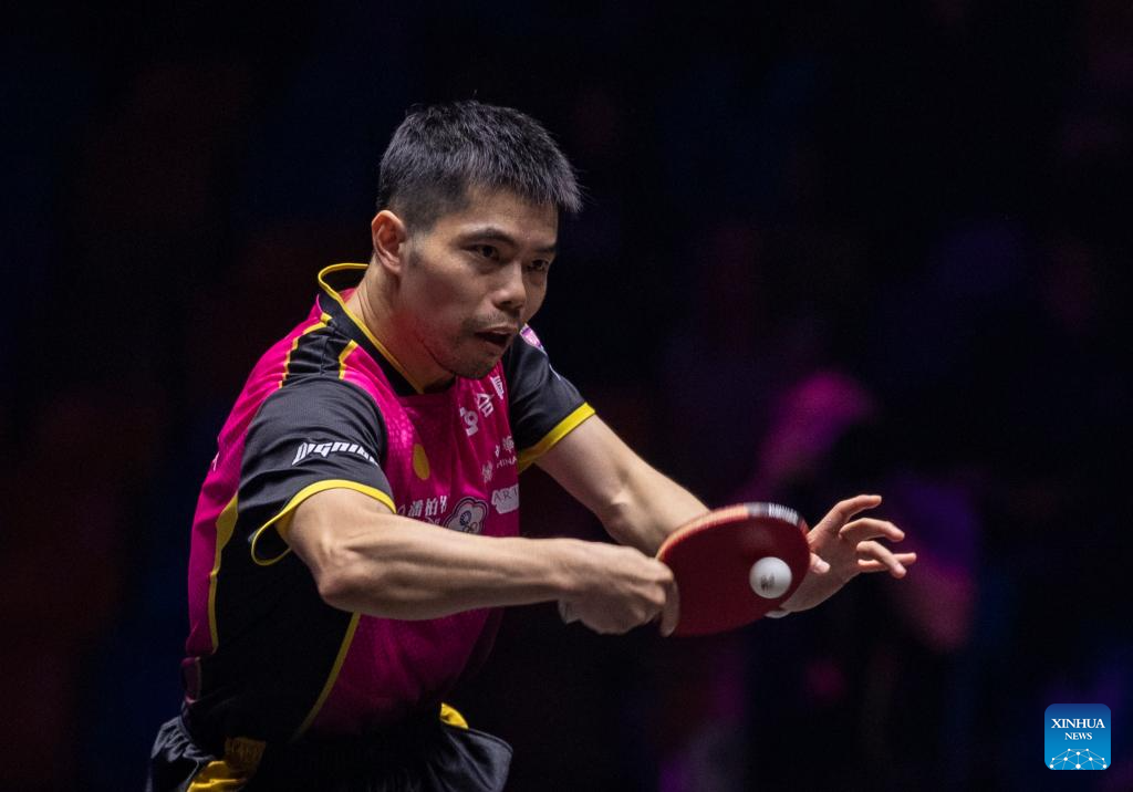 Chuang Chih-Yuan of Chinese Taipei hits a return during the men's singles round of 32 match against Ma Long of China at the WTT Champions Frankfurt 2023 in Frankfurt, Germany, Oct. 31, 2023. (Xinhua/Zhang Fan)
