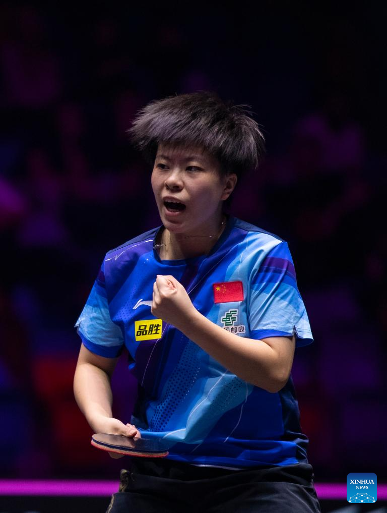 Wang Yidi of China reacts during the women's singles round of 32 match against Sofia Polcanova of Austria at the WTT Champions Frankfurt 2023 in Frankfurt, Germany, Oct. 31, 2023. (Xinhua/Zhang Fan)