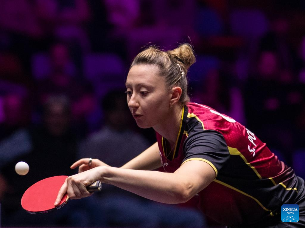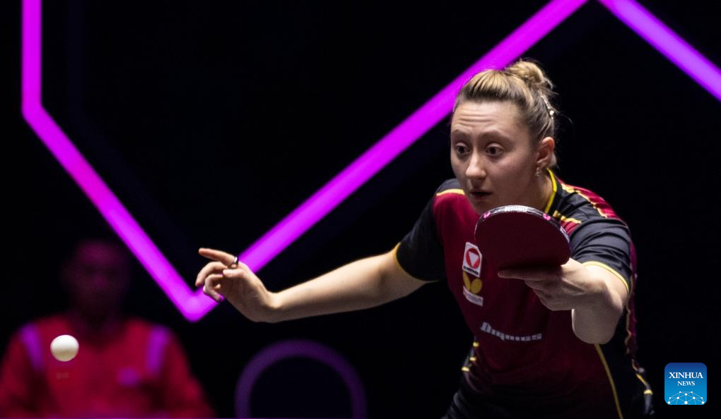 Sofia Polcanova of Austria hits a return during the women's singles round of 32 match against Wang Yidi of China at the WTT Champions Frankfurt 2023 in Frankfurt, Germany, Oct. 31, 2023. (Xinhua/Zhang Fan)