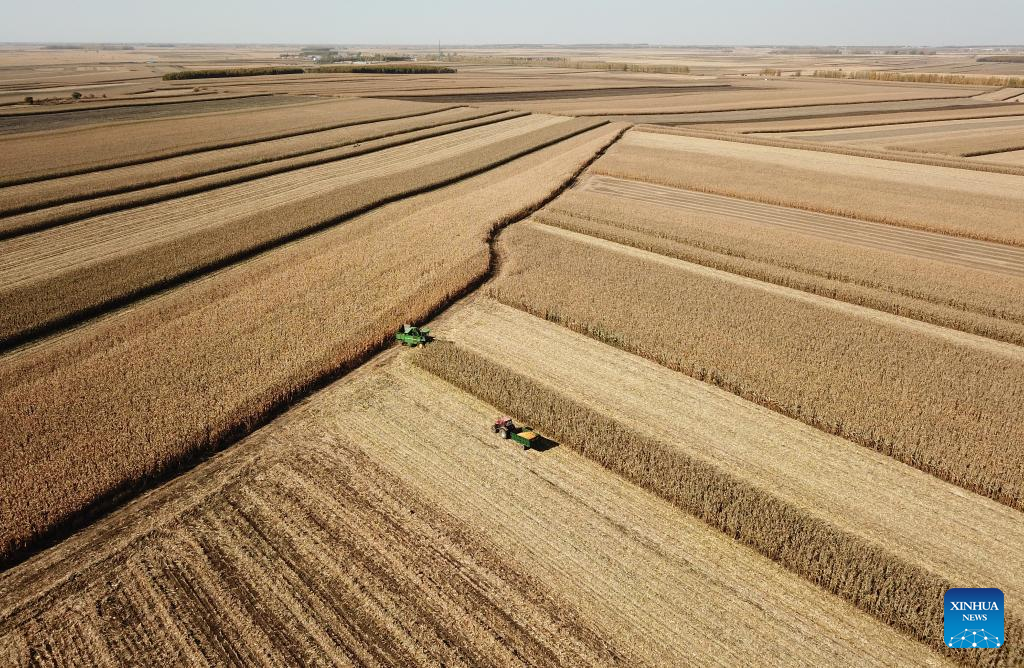 This aerial photo taken on Oct. 11, 2023 shows agricultural machines harvesting corns in Fujin City, northeast China's Heilongjiang Province. (Xinhua/Wang Jianwei)