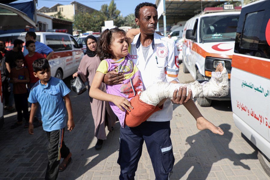 A medical worker transfers a wounded girl in the southern Gaza Strip city of Rafah, Nov. 1, 2023. Egypt received on Wednesday wounded Palestinians from the besieged Gaza Strip via the Rafah crossing, the only linking point between Egypt and the enclave, according to a security source. (Photo by Rizek Abdeljawad/Xinhua)