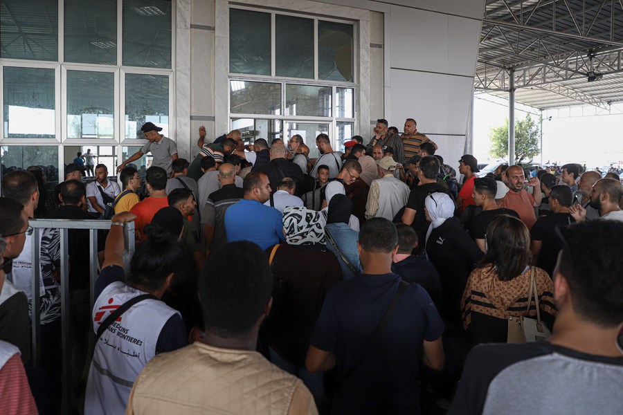 People wait to leave the Gaza Strip for Egypt via the Rafah crossing in the southern Gaza Strip, Nov. 1, 2023. Some foreign passport holders crossed into Egypt on Wednesday from the Gaza Strip via the Rafah crossing, the only linking point between Egypt and the besieged enclave, local sources told Xinhua. (Photo by Rizek Abdeljawad/Xinhua)