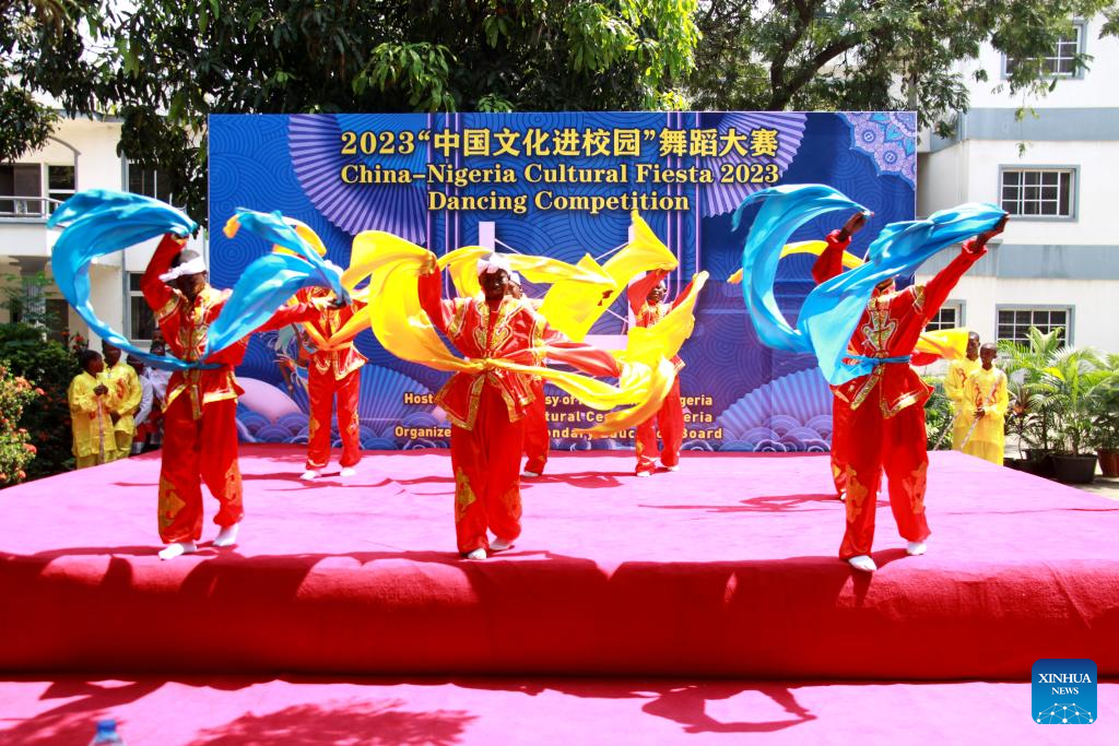 Students perform a Chinese dance during a dancing competition at the 2023 annual China-Nigeria Cultural Fiesta in Abuja, Nigeria, on Oct. 31, 2023. (China Cultural Center in Nigeria/Handout via Xinhua)
