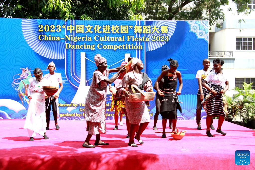 Students perform a Nigerian dance during a dancing competition at the 2023 annual China-Nigeria Cultural Fiesta in Abuja, Nigeria, on Oct. 31, 2023. (China Cultural Center in Nigeria/Handout via Xinhua)