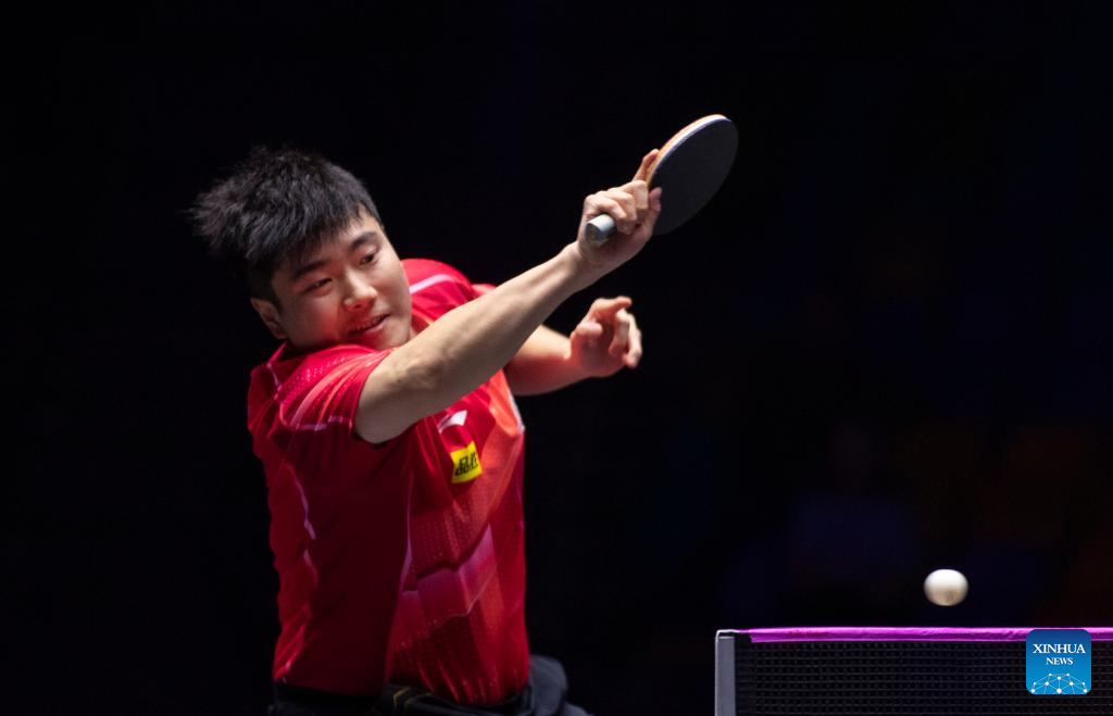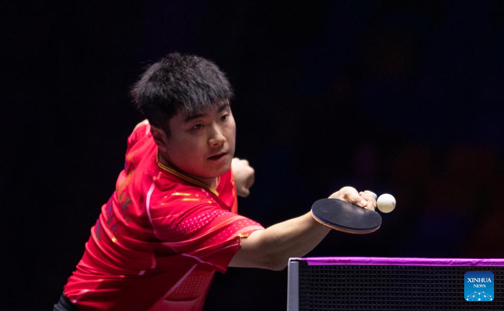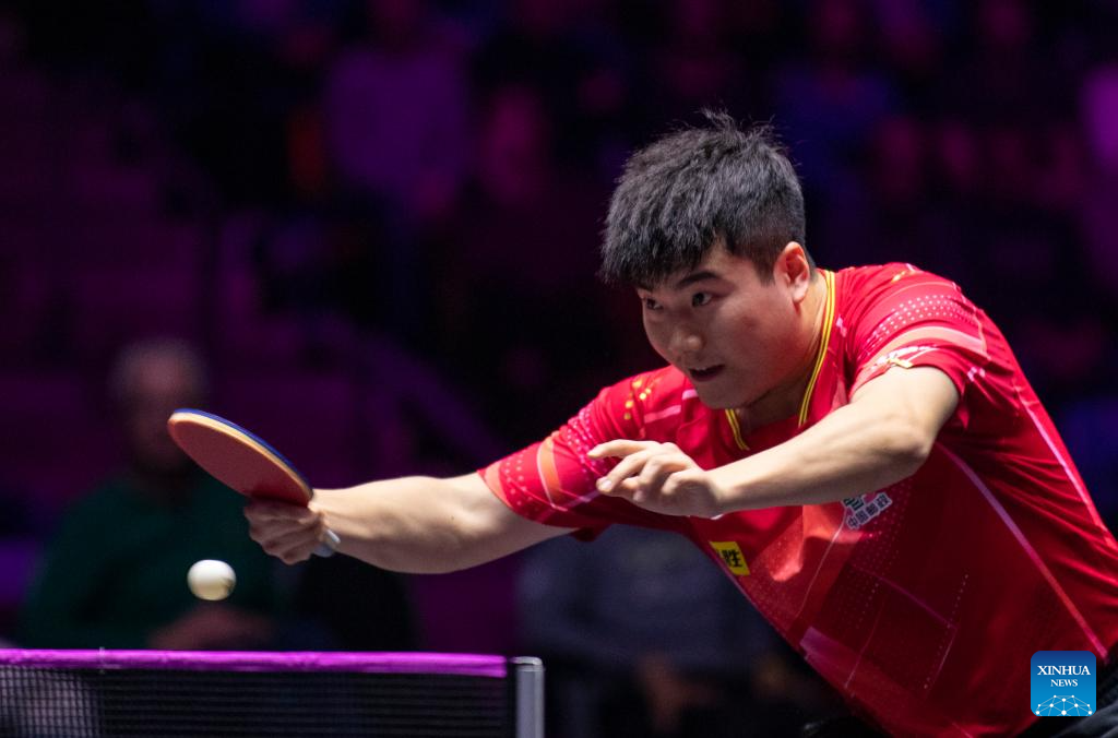 Liang Jingkun competes during the men's singles round of 16 match between Liang Jingkun of China and Lim Jonghoon of South Korea at the WTT Champions Frankfurt 2023 in Frankfurt, Germany, Nov. 1, 2023. (Xinhua/Zhang Fan)