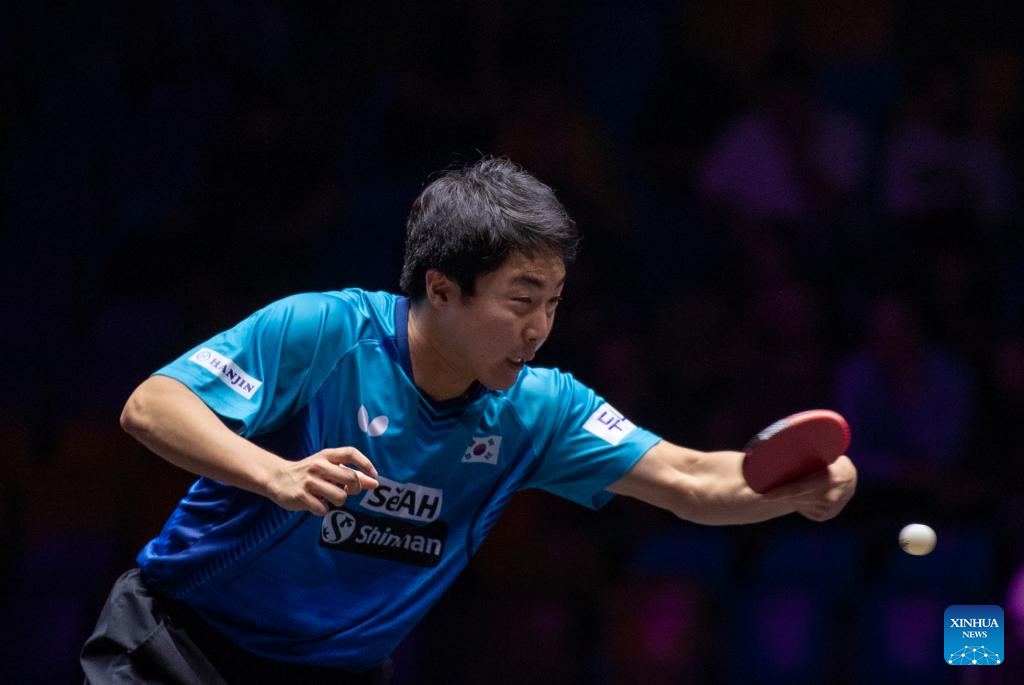 Lim Jonghoon competes during the men's singles round of 16 match between Liang Jingkun of China and Lim Jonghoon of South Korea at the WTT Champions Frankfurt 2023 in Frankfurt, Germany, Nov. 1, 2023. (Xinhua/Zhang Fan)