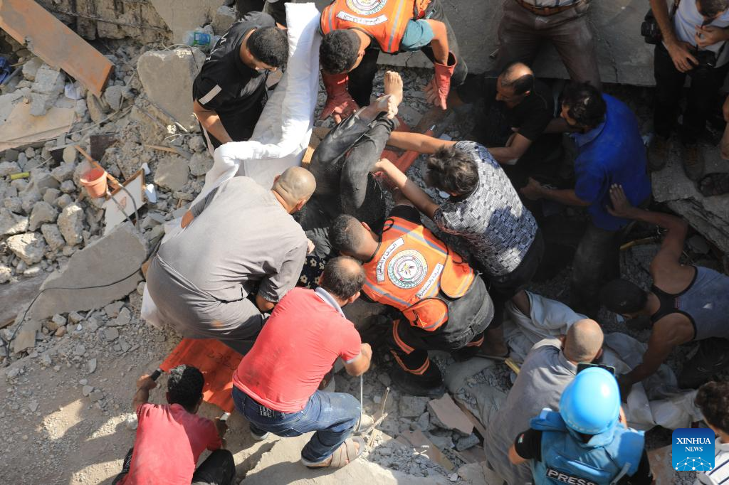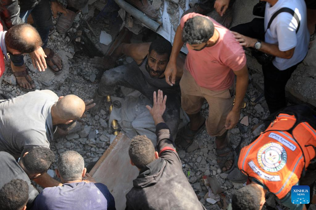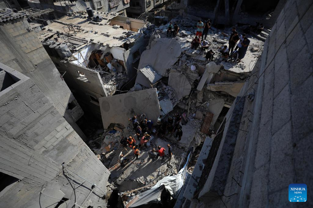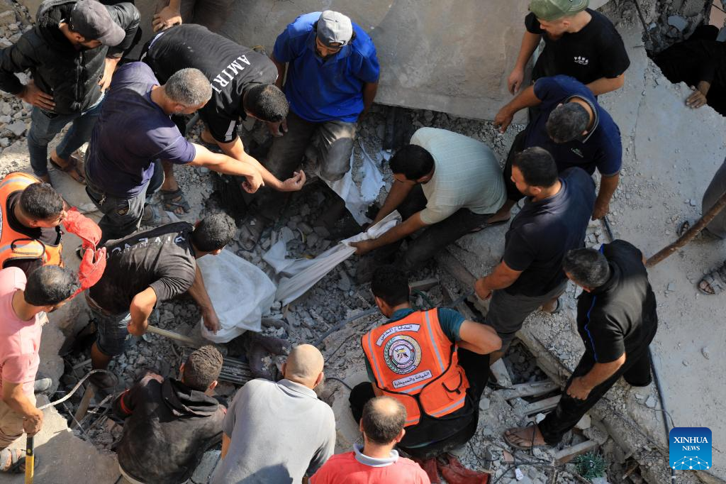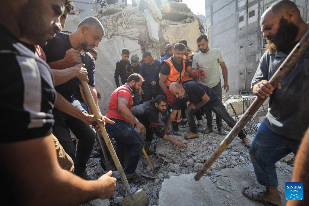 People conduct rescue work among the rubble of buildings destroyed in Israeli airstrikes in the southern Gaza Strip city of Khan Younis, on Nov. 1, 2023. At least 8,525 Palestinians have been killed by Israeli strikes in Gaza since the beginning of the latest Israel-Hamas conflict starting from Oct. 7, according to the Gaza-based Health Ministry. Meanwhile, the Israeli military said the latest conflict has killed at least 1,400 people in Israel. (Photo by Yasser Qudih/Xinhua)