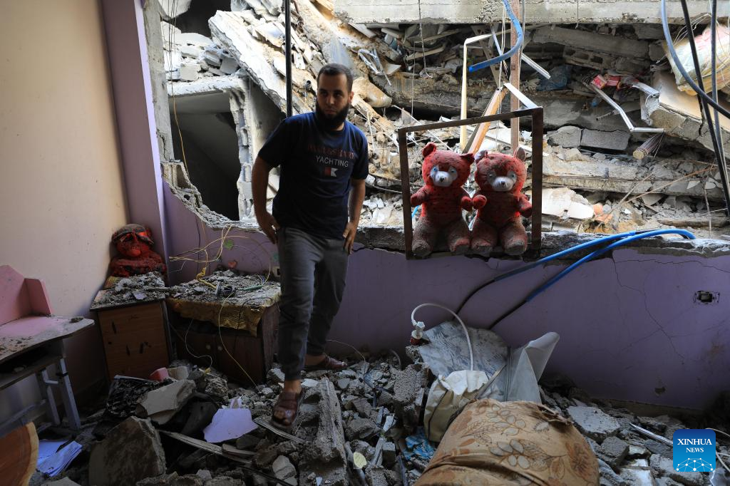 A man stands among the rubble of a building destroyed in an Israeli airstrike in the southern Gaza Strip city of Khan Younis, on Nov. 1, 2023. At least 8,525 Palestinians have been killed by Israeli strikes in Gaza since the beginning of the latest Israel-Hamas conflict starting from Oct. 7, according to the Gaza-based Health Ministry. Meanwhile, the Israeli military said the latest conflict has killed at least 1,400 people in Israel. (Photo by Yasser Qudih/Xinhua)