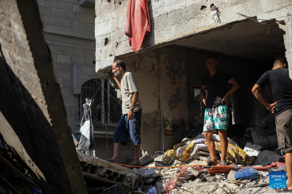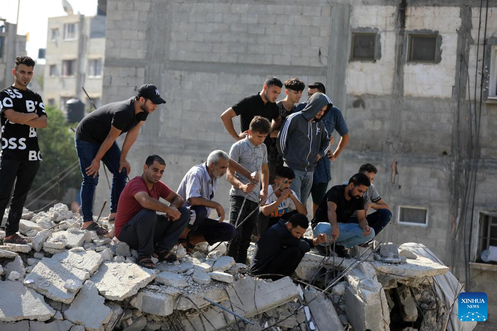 People are seen among the rubble of buildings destroyed in Israeli airstrikes in the southern Gaza Strip city of Khan Younis, on Nov. 1, 2023. At least 8,525 Palestinians have been killed by Israeli strikes in Gaza since the beginning of the latest Israel-Hamas conflict starting from Oct. 7, according to the Gaza-based Health Ministry. Meanwhile, the Israeli military said the latest conflict has killed at least 1,400 people in Israel. (Photo by Yasser Qudih/Xinhua)