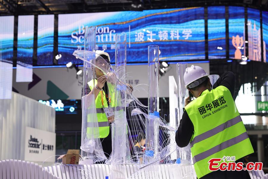 Workers set up an exhibition area at the National Exhibition and Convention Center, the main venue for the upcoming sixth China International Import Expo (CIIE), in Shanghai, Nov. 1, 2023. (Photo: China News Network/Tang Yanjun)