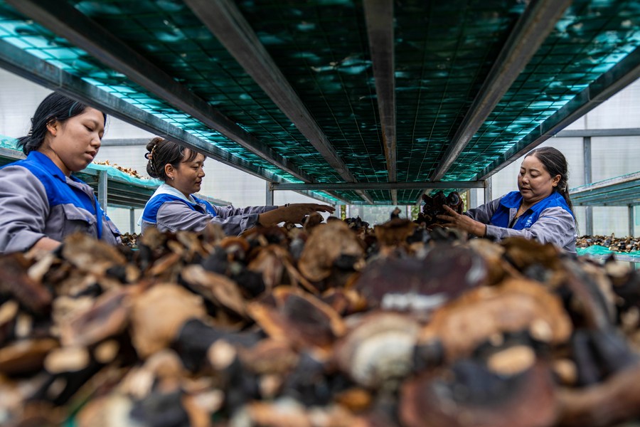 Workers dry lingzhi mushrooms at an under-forest resources planting cooperative in Medog, southwest China's Tibet Autonomous Region, Oct. 12, 2023. (Xinhua/Sun Fei)