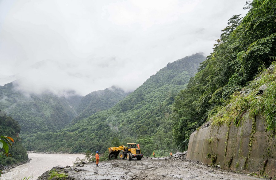 Highway maintenance crews rush to clear a road in Medog, southwest China's Tibet Autonomous Region, Oct. 12, 2023. (Xinhua/Sun Fei)