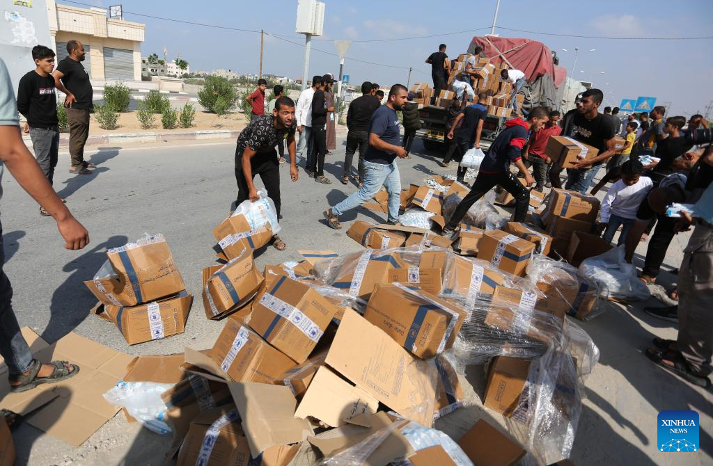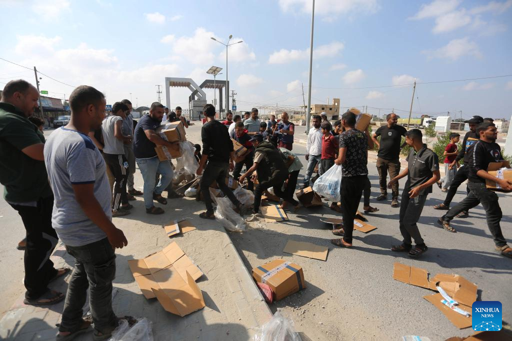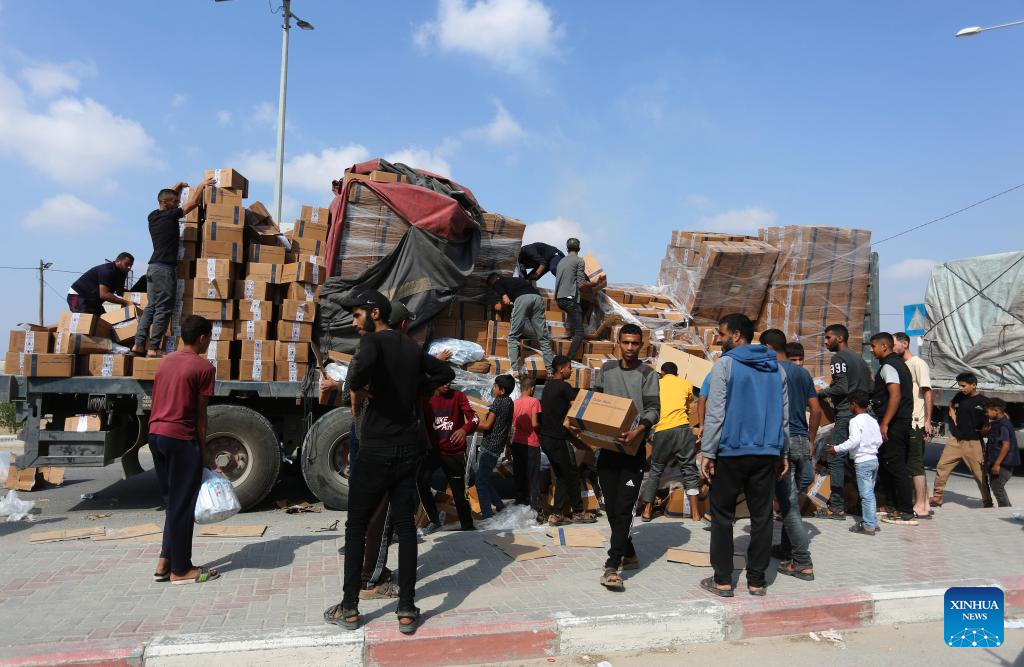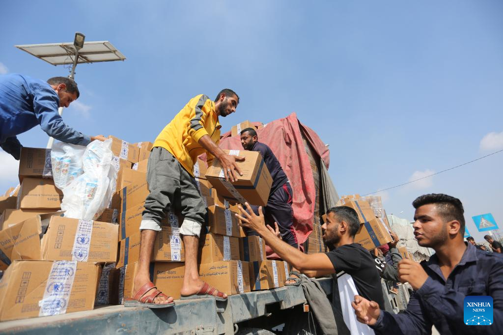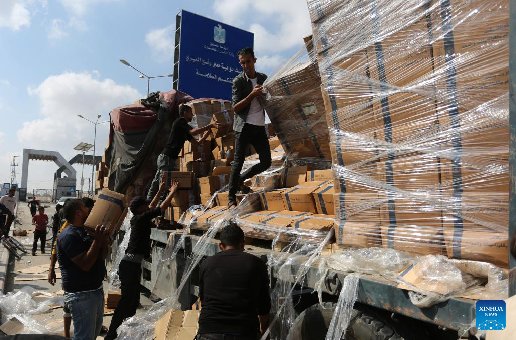 People unload humanitarian aid from a truck at the Rafah crossing in the southern Gaza Strip, on Nov. 2, 2023. A convoy of 73 trucks carrying humanitarian aid supplies is entering the besieged Gaza Strip, and hundreds of more evacuees are expected to arrive in Egypt via the Rafah border crossing on Thursday, an Egyptian source told Xinhua on the condition of anonymity. (Photo by Khaled Omar/Xinhua)