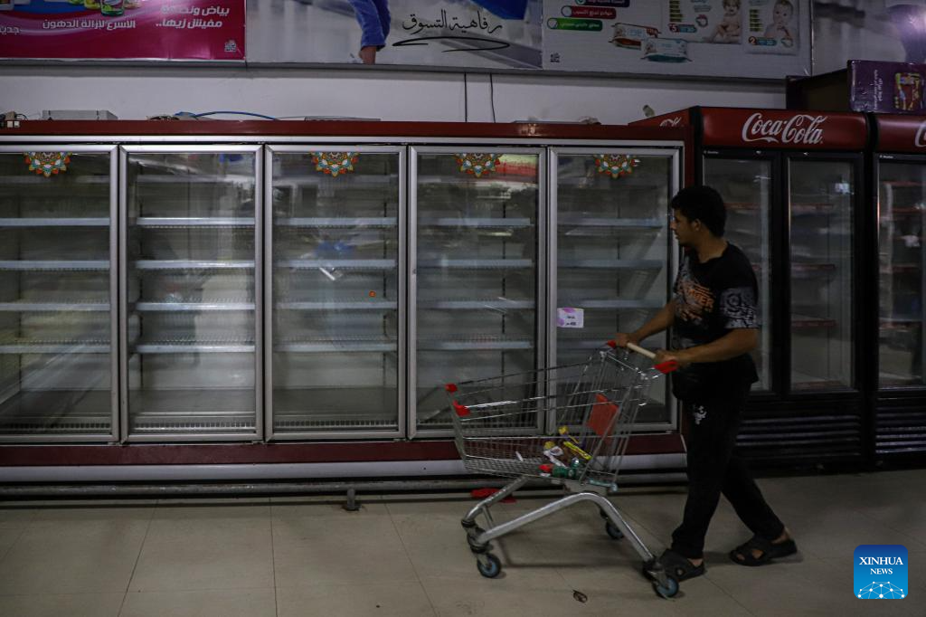 A man shops at a supermarket in the southern Gaza Strip city of Khan Younis, on Nov. 2, 2023. The Palestinian Islamic Resistance Movement (Hamas) launched a surprise attack on Israel on Oct. 7, firing thousands of rockets and infiltrating Israeli territory, to which Israel responded with massive airstrikes and punitive measures, including a siege on the enclave with supplies of water, electricity, fuel, and other necessities being cut off. (Photo by Rizek Abdeljawad/Xinhua)
