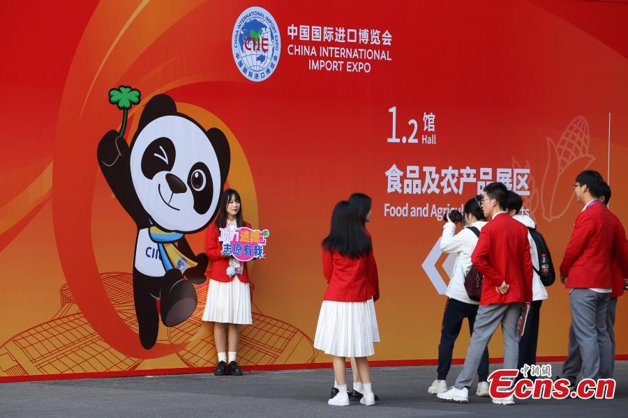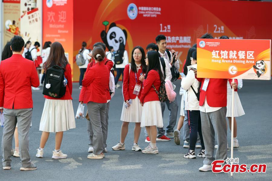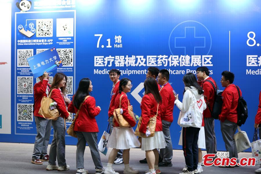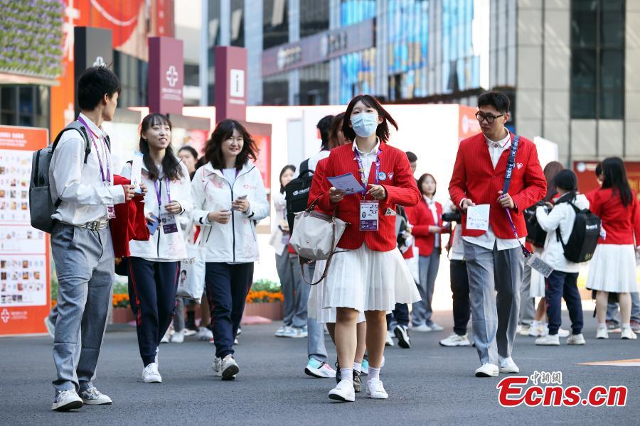 Volunteers prepare to attend an on-site training session for the 6th China International Import Expo (CIIE) at the National Exhibition and Convention Center in Shanghai, Nov. 2, 2023. (Photo: China News Network/Tang Yanjun)