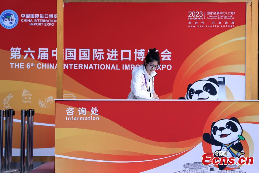 A volunteer makes preparation work at the information desk during an on-site training session for the 6th China International Import Expo (CIIE) at the National Exhibition and Convention Center in Shanghai, Nov. 2, 2023. (Photo: China News Network/Tang Yanjun)