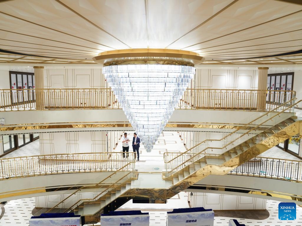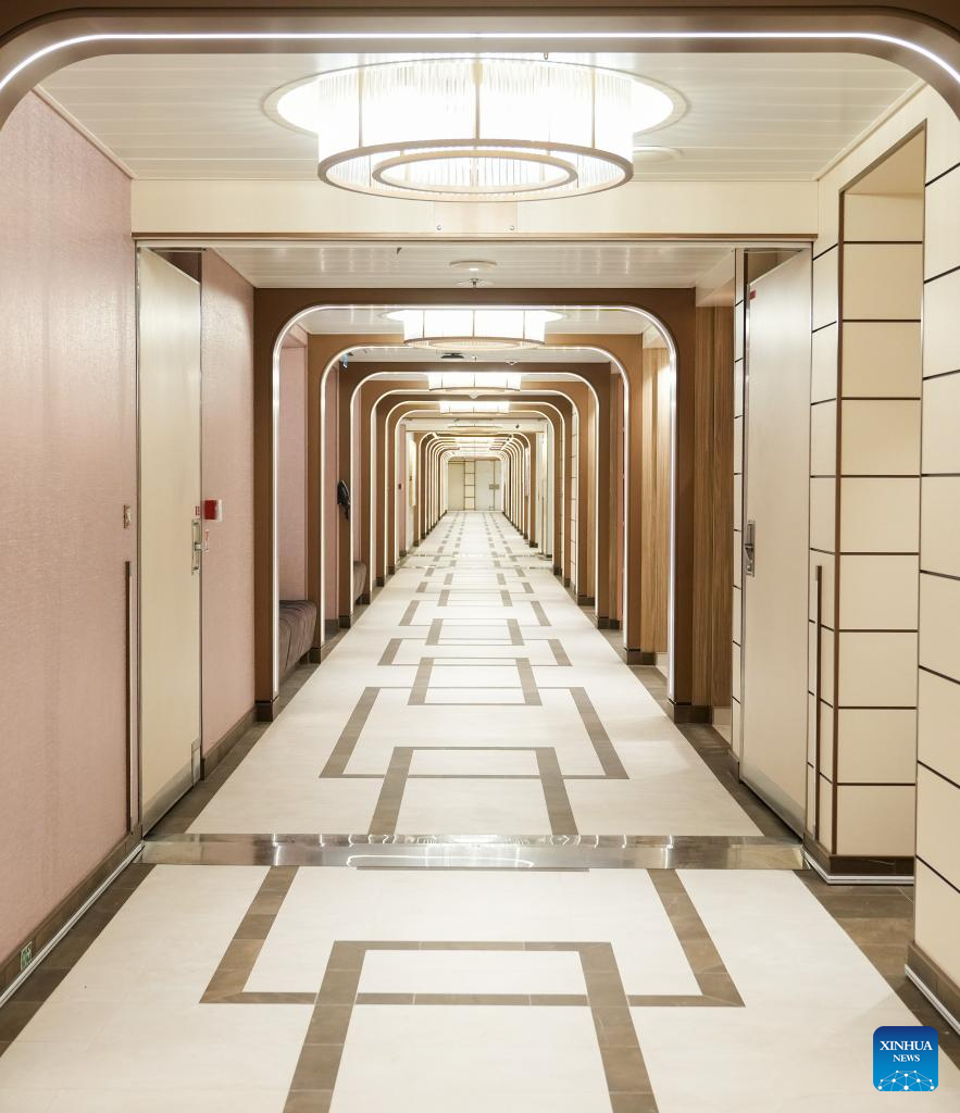 This photo taken on Nov. 4, 2023 shows the interior view of cruise ship "Adora Magic City" in Shanghai, east China. After five years of design, building and a subsequent trial voyage, China's first domestically-built large cruise ship, the "Adora Magic City," was delivered in Shanghai on Saturday, with its maiden voyage scheduled for Jan. 1, 2024. (Xinhua/Ding Ting)
