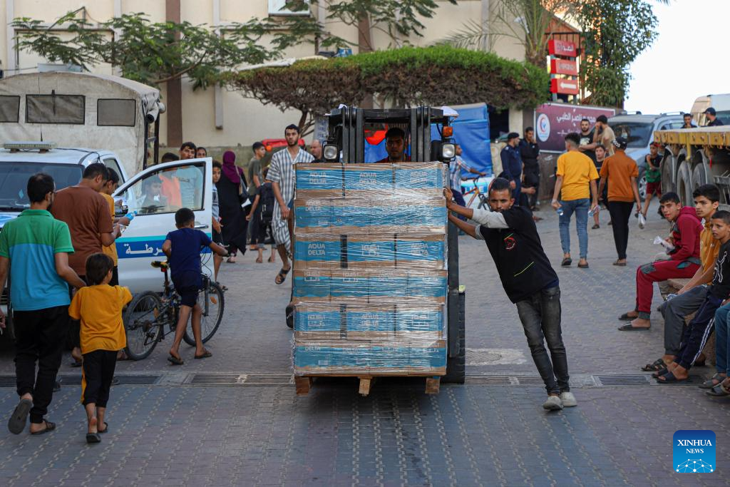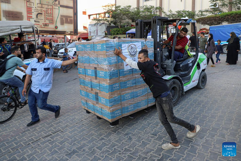 Workers deliver relief supplies in the southern Gaza Strip city of Khan Younis Nov. 4, 2023. (Photo by Rizek Abdeljawad/Xinhua)