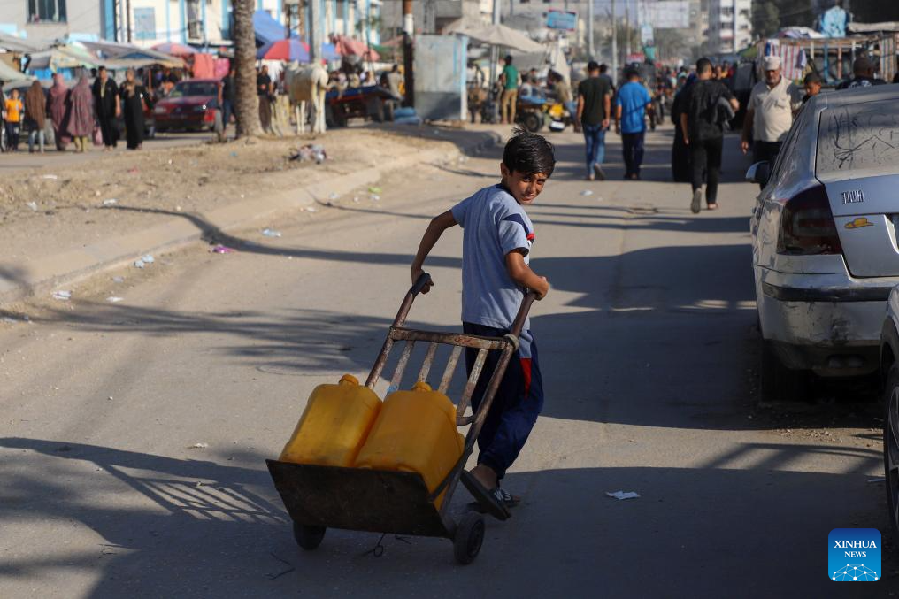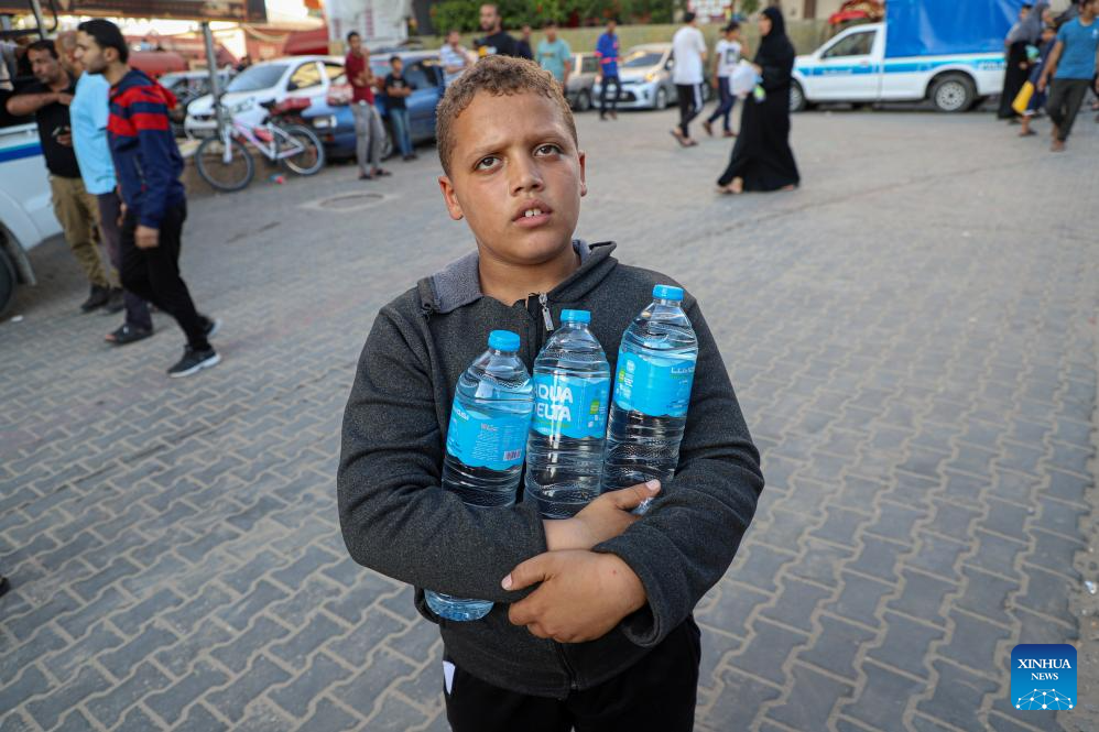 A boy holds bottles of water he got from supplies in the southern Gaza Strip city of Khan Younis Nov. 4, 2023. (Photo by Rizek Abdeljawad/Xinhua)