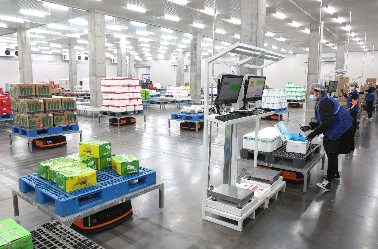Robots are sorting fresh products at a logistics center in Xiangyang, central China's Hubei province. (Photo by Yang Dong/People's Daily Online)