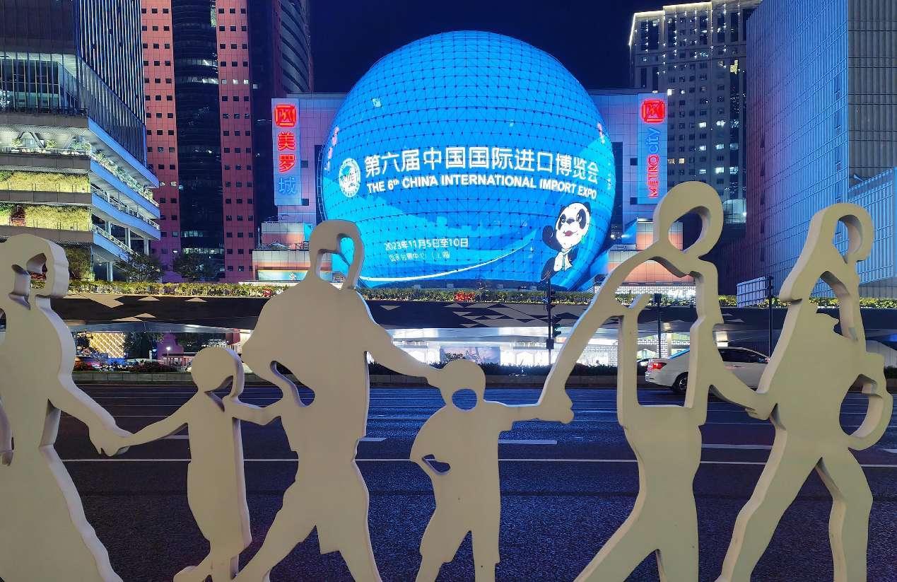 A promotional video for the China International Import Expo is displayed on a naked-eye 3D spherical screen outside the Metro City shopping mall in the Xujiahui area of Shanghai. (Photo by Chen Yuyu/People's Daily Online)