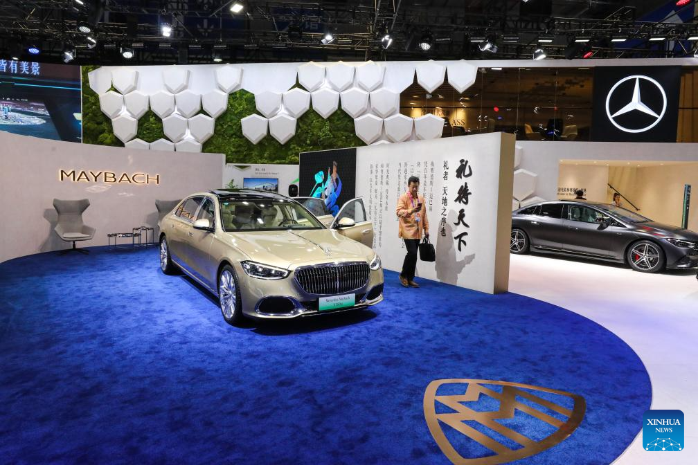 This photo taken on Nov. 5, 2023 shows a Mercedes-Maybach S 580e sedan displayed at the 6th China International Import Expo (CIIE) in east China's Shanghai. The 6th China International Import Expo kicked off here on Sunday, with many cutting-edge technologies and new products making their debuts at the event. (Xinhua/Xin Mengchen)