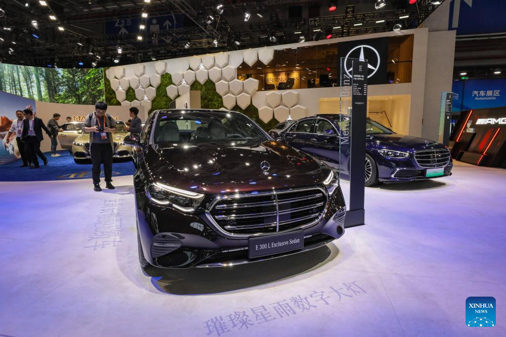 This photo taken on Nov. 5, 2023 shows a Mercedes-Benz E300L sedan (front) displayed at the 6th China International Import Expo (CIIE) in east China's Shanghai. The 6th China International Import Expo kicked off here on Sunday, with many cutting-edge technologies and new products making their debuts at the event. (Xinhua/Xin Mengchen)