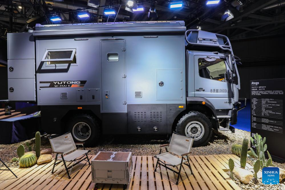 This photo taken on Nov. 5, 2023 shows a Mercedes Atego 4x4 expedition vehicle displayed at the 6th China International Import Expo (CIIE) in east China's Shanghai. The 6th China International Import Expo kicked off here on Sunday, with many cutting-edge technologies and new products making their debuts at the event. (Xinhua/Xin Mengchen)