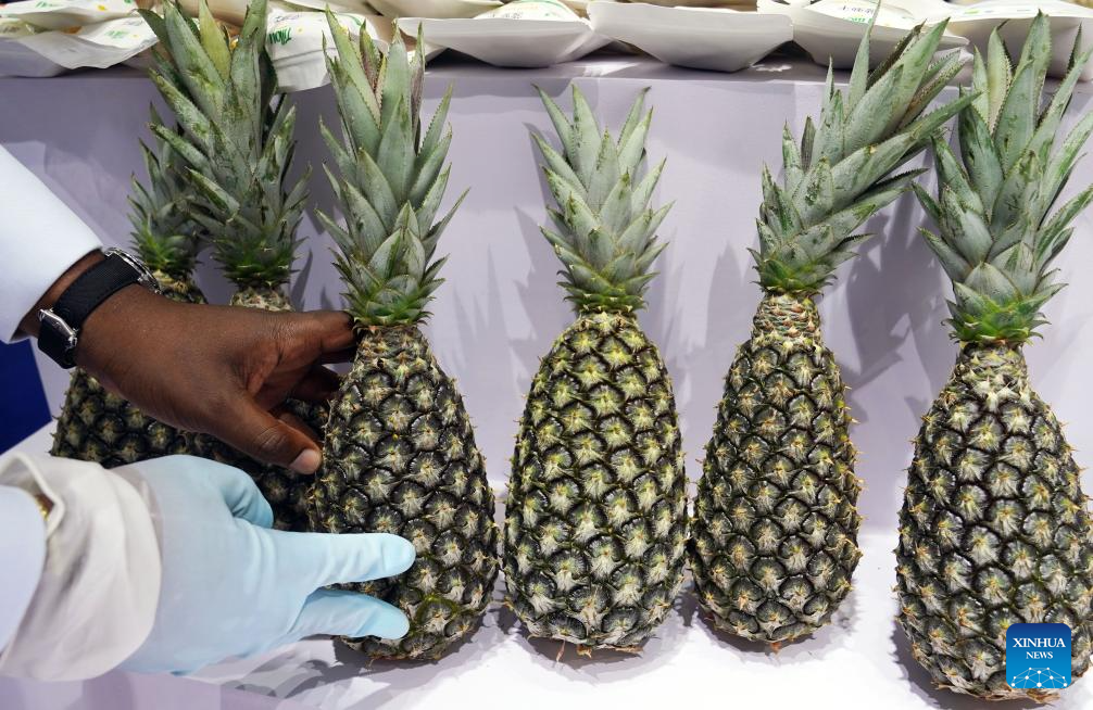 Benin's pineapples make their debut in China at the 6th China International Import Expo (CIIE) in east China's Shanghai, Nov. 5, 2023. The 6th China International Import Expo kicked off here on Sunday, with many cutting-edge technologies and new products making their debuts at the event. (Xinhua/Liu Ying)