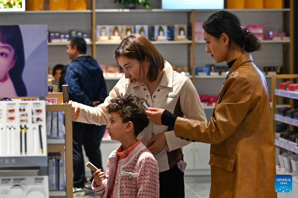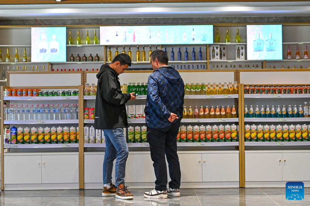 Customers select commodities at the cross-border e-commerce import and export commodities exhibition and trading center in the comprehensive bonded zone in Kashgar Prefecture, northwest China's Xinjiang Uygur Autonomous Region, Nov. 4, 2023. (Xinhua/Ding Lei)