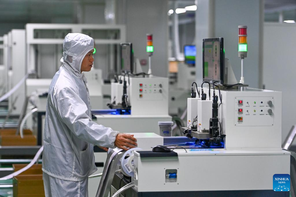 A staff member works at the workshop of an electronic technology company in the comprehensive bonded zone in Kashgar Prefecture, northwest China's Xinjiang Uygur Autonomous Region, Nov. 4, 2023. (Xinhua/Ding Lei)