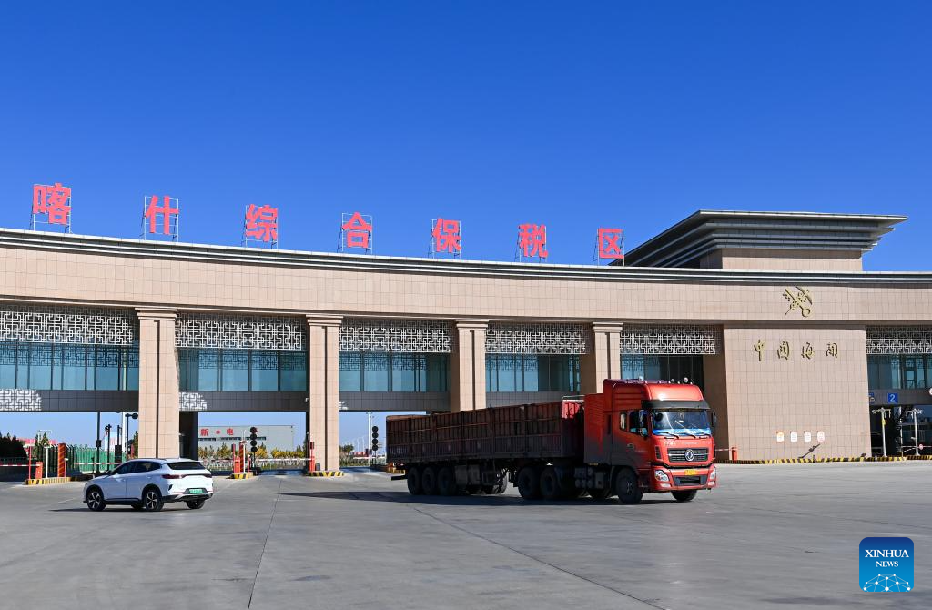 A truck drives out of the comprehensive bonded zone in Kashgar Prefecture, northwest China's Xinjiang Uygur Autonomous Region, Nov. 4, 2023. (Xinhua/Ding Lei)